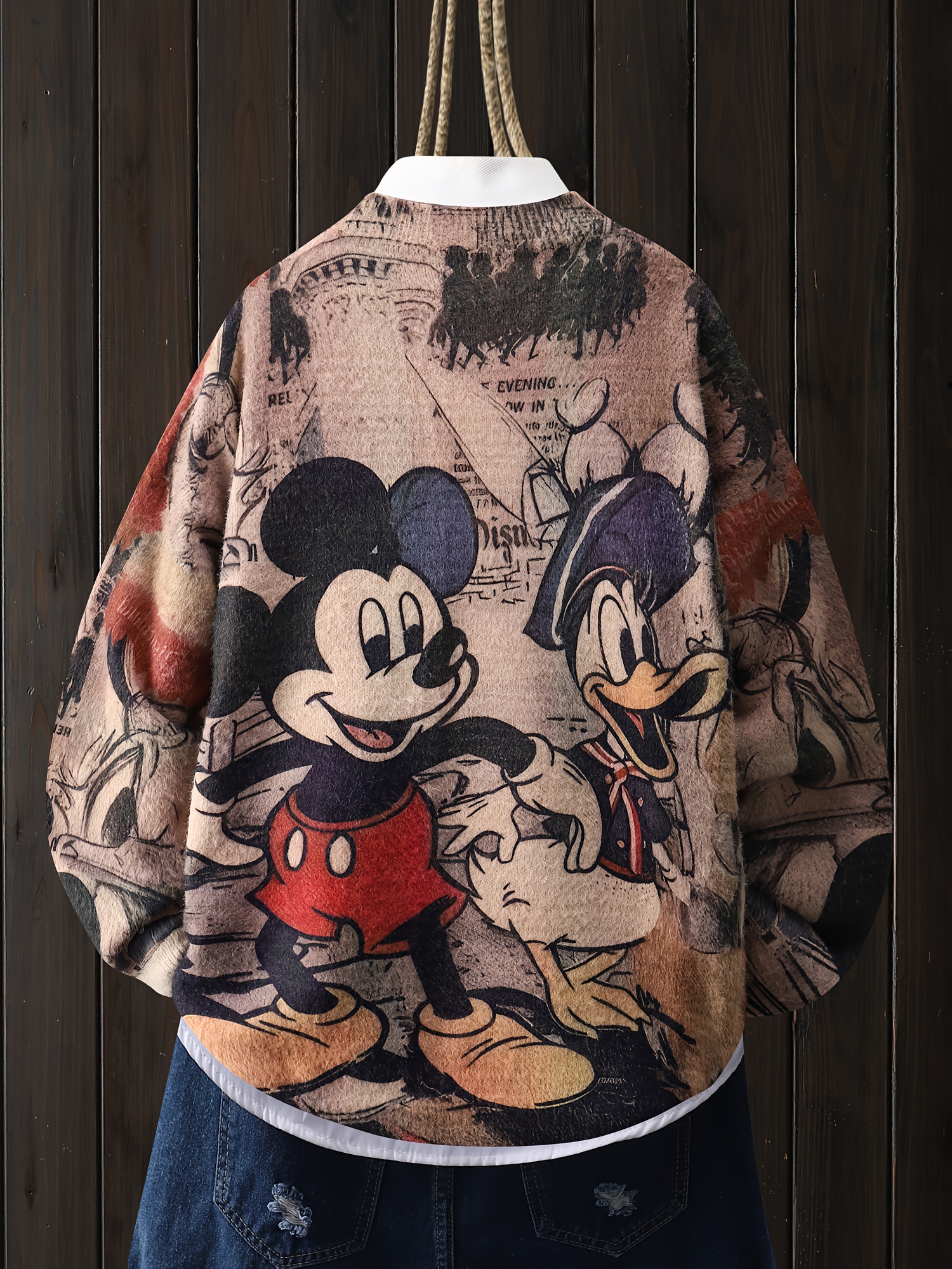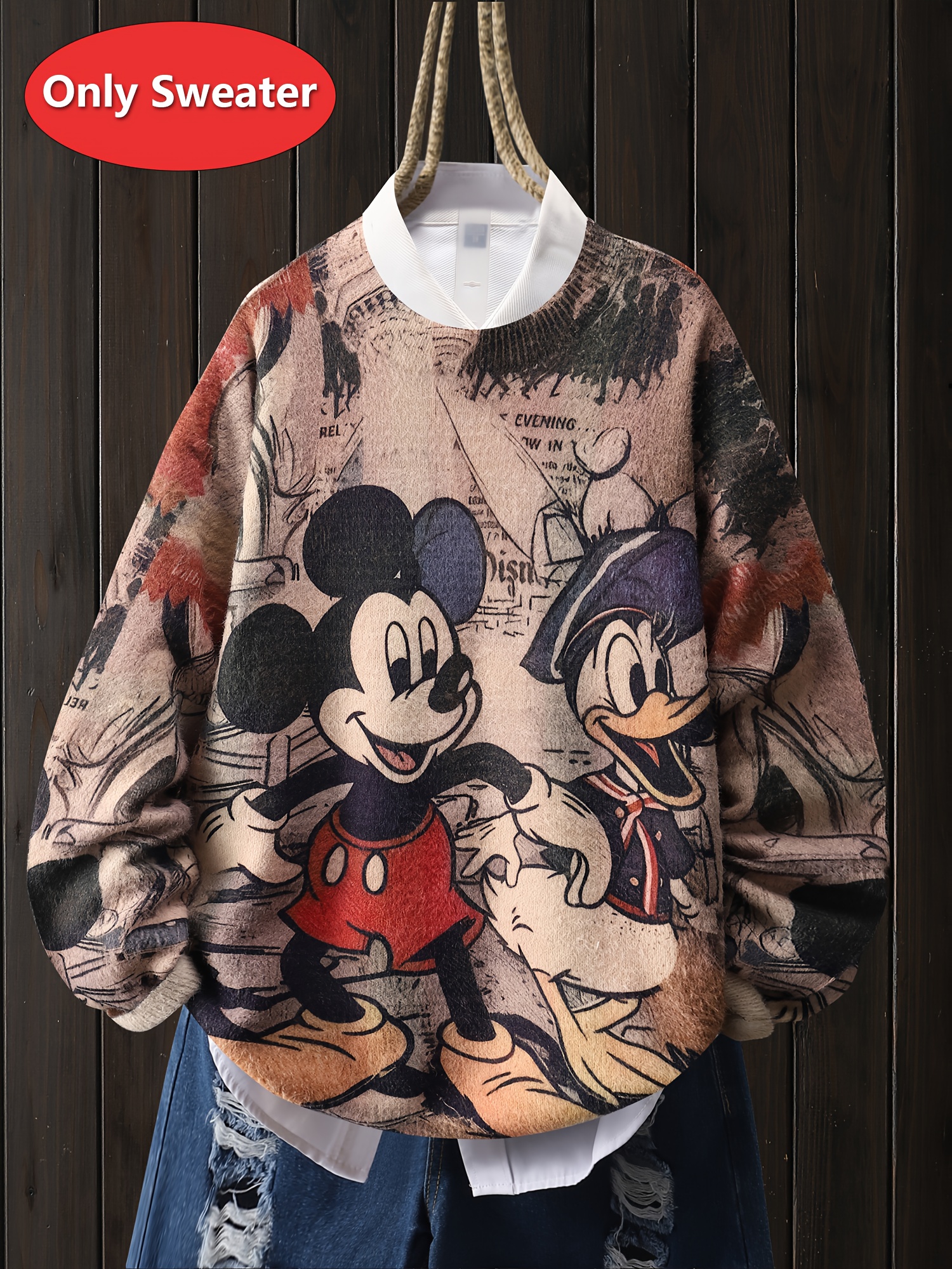 [Disney Vintage Cartoon Sweater] Disney Mickey Mouse & Minnie Mouse Vintage Cartoon Print Women's Sweater - Soft Stretchy Long Sleeve Pullover with Ribbed Trim, Loose Fit Round Neck Casual Top for All-Season Comfort, Cute Character Design
