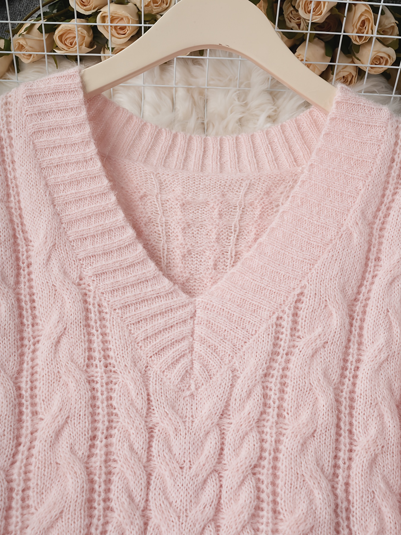 Gentle Pink Lazy Style Premium Loose V-Neck Twist Sweater for Women