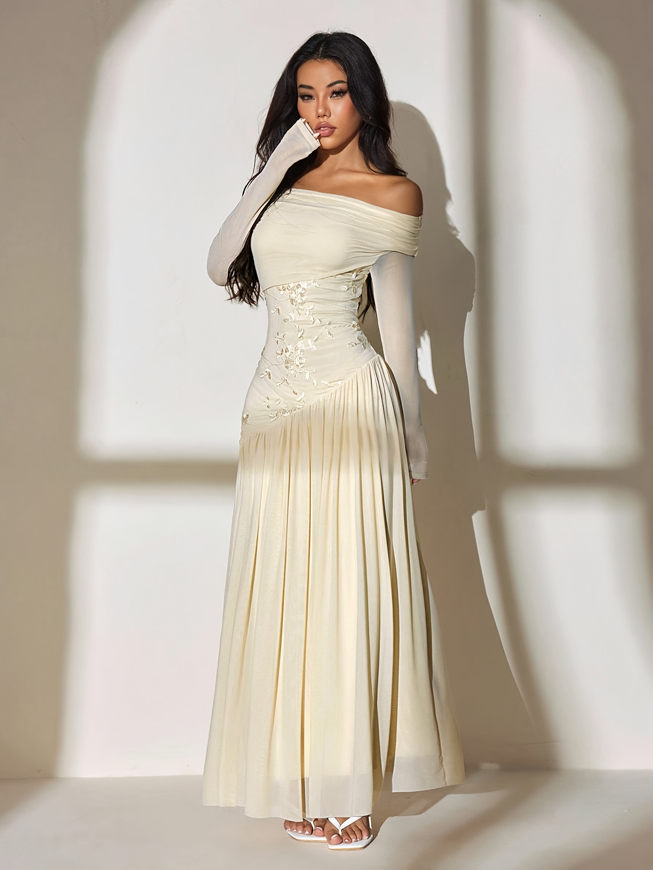 [Wedding Dresses] Women's Elegant Off-the-Shoulder Formal Dress - Beige/ Long Sleeve Party Wedding Gown, Stretchy Bodycon Fit, Machine Washable Evening Attire for Women, Wedding Dresses, Holiday Outfit, Asymmetrical Skirt, Highelasticity Fabric