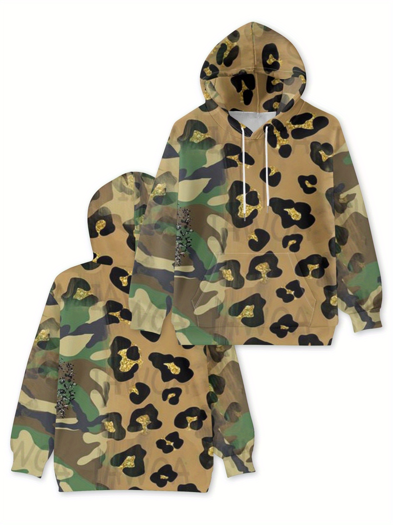 Women'S Camo Leopard Print Hoodie - Stylish Long Sleeve Pullover with Drawstring, 3D Digital Print, Stretchy Polyester, Casual Fit, Green & Black Design, Casual Wear Hoodie | Trendy Casual Style | Drawstring Hoodie