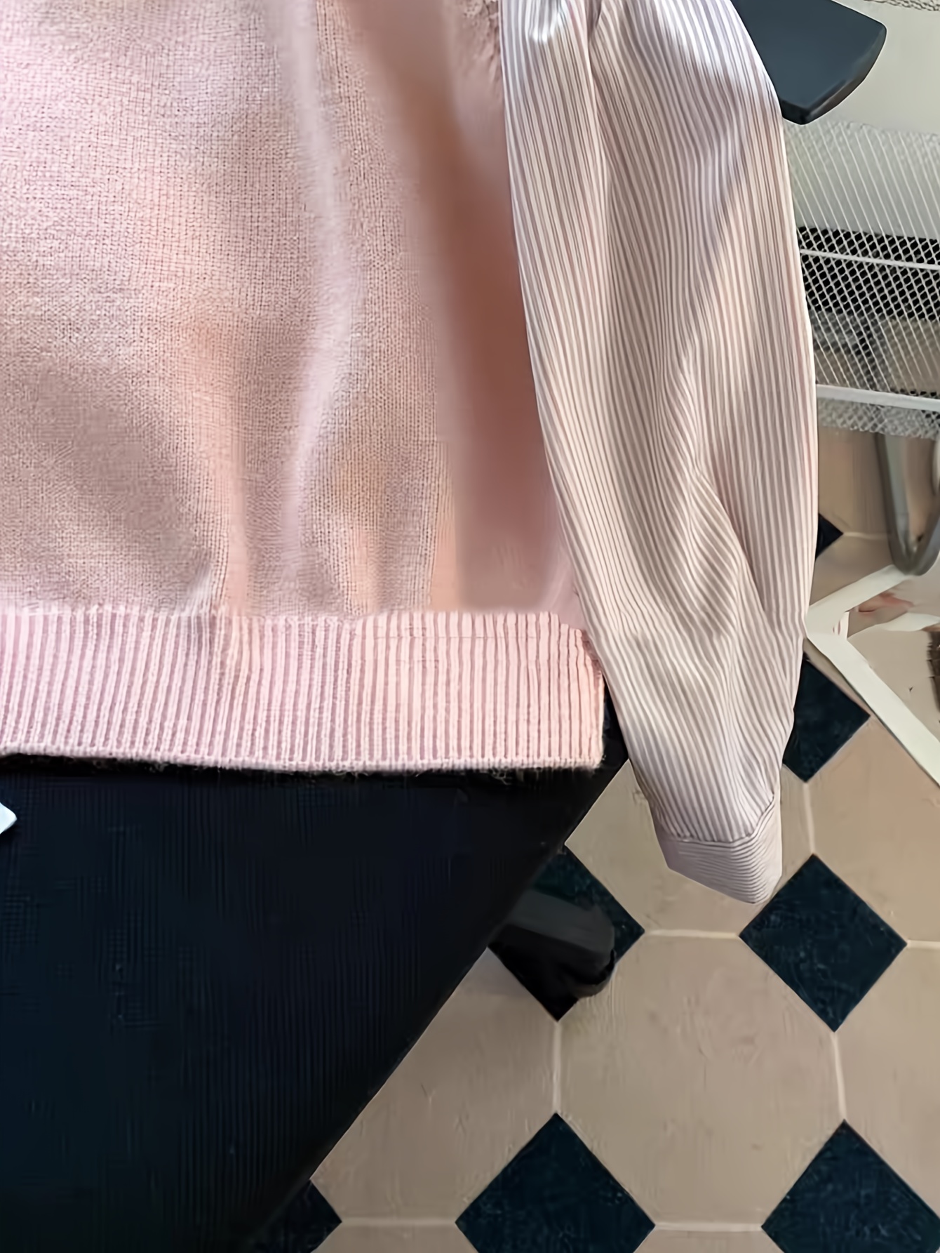Women's Elegant Collar Sweater - Two-in-One Mock Layering Design, All-Season Office & Formal Events Sweater in Grey & Blue Horizontal Stripes, Non-Transparent Sweater for Women, Ladies Sweaters, Comfortable Fit