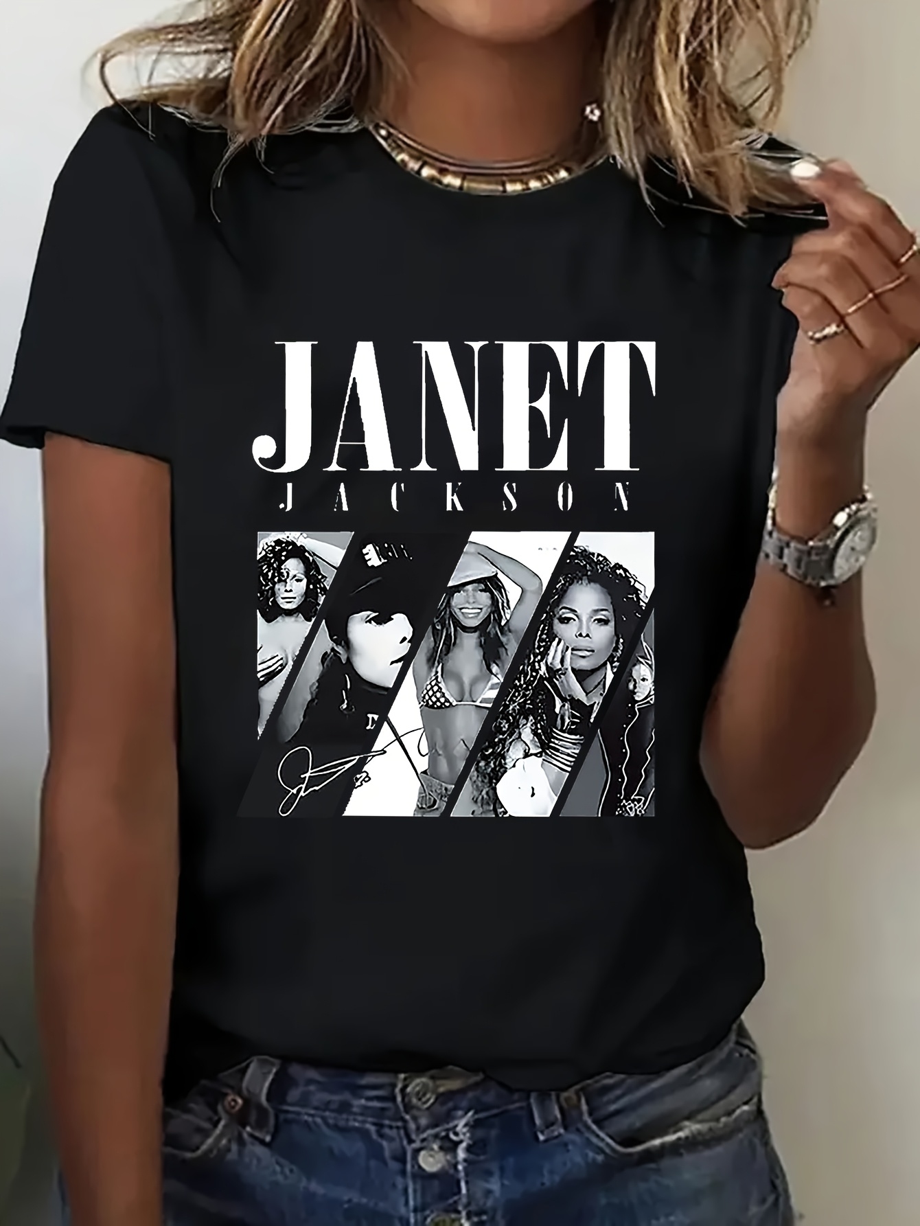 1pc Women's Janet Jackson Graphic T-Shirt - Black Casual Short Sleeve Tee with Iconic Signature & Pose Design, Soft Round Neck, Machine Washable, Birthday Gift for Women & Teens, Everyday Casual Wear