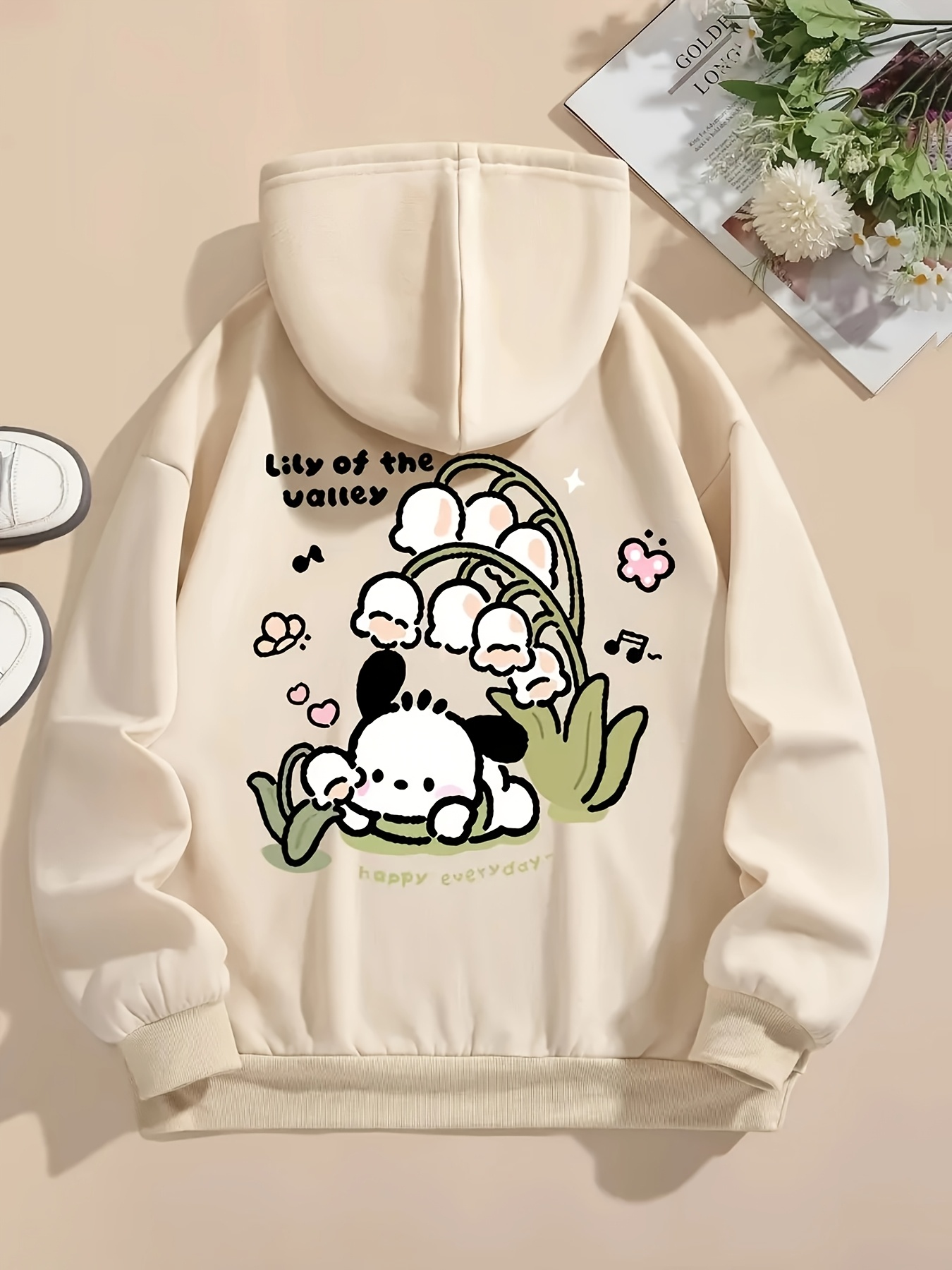 [Cute Cartoon Hoodie] Cute Cartoon Graphic Women's Fashion Hoodie | Long Sleeve, Drawstring Hood, Beige, Casual Fall/Winter Pullover