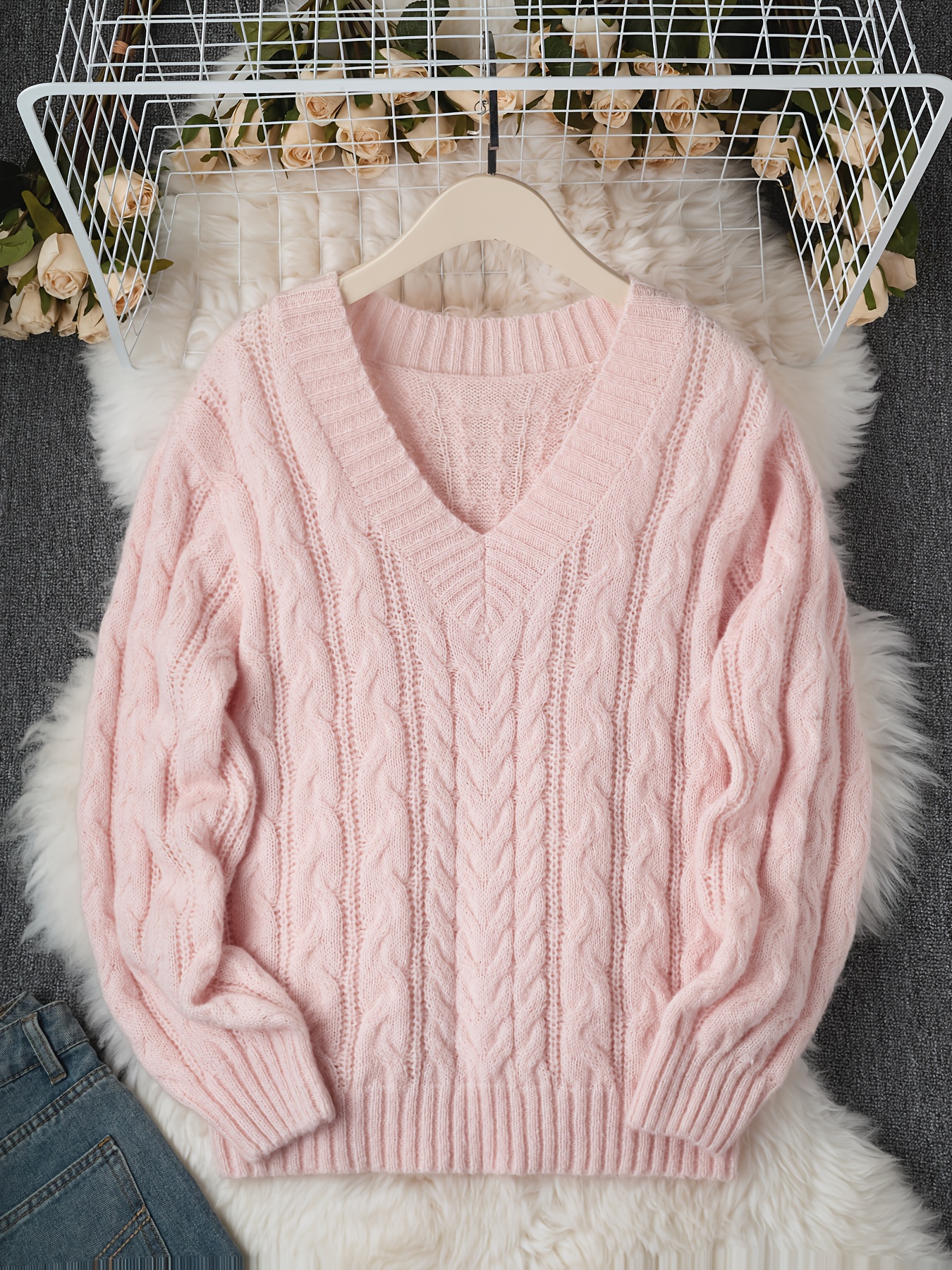 Gentle Pink Lazy Style Premium Loose V-Neck Twist Sweater for Women