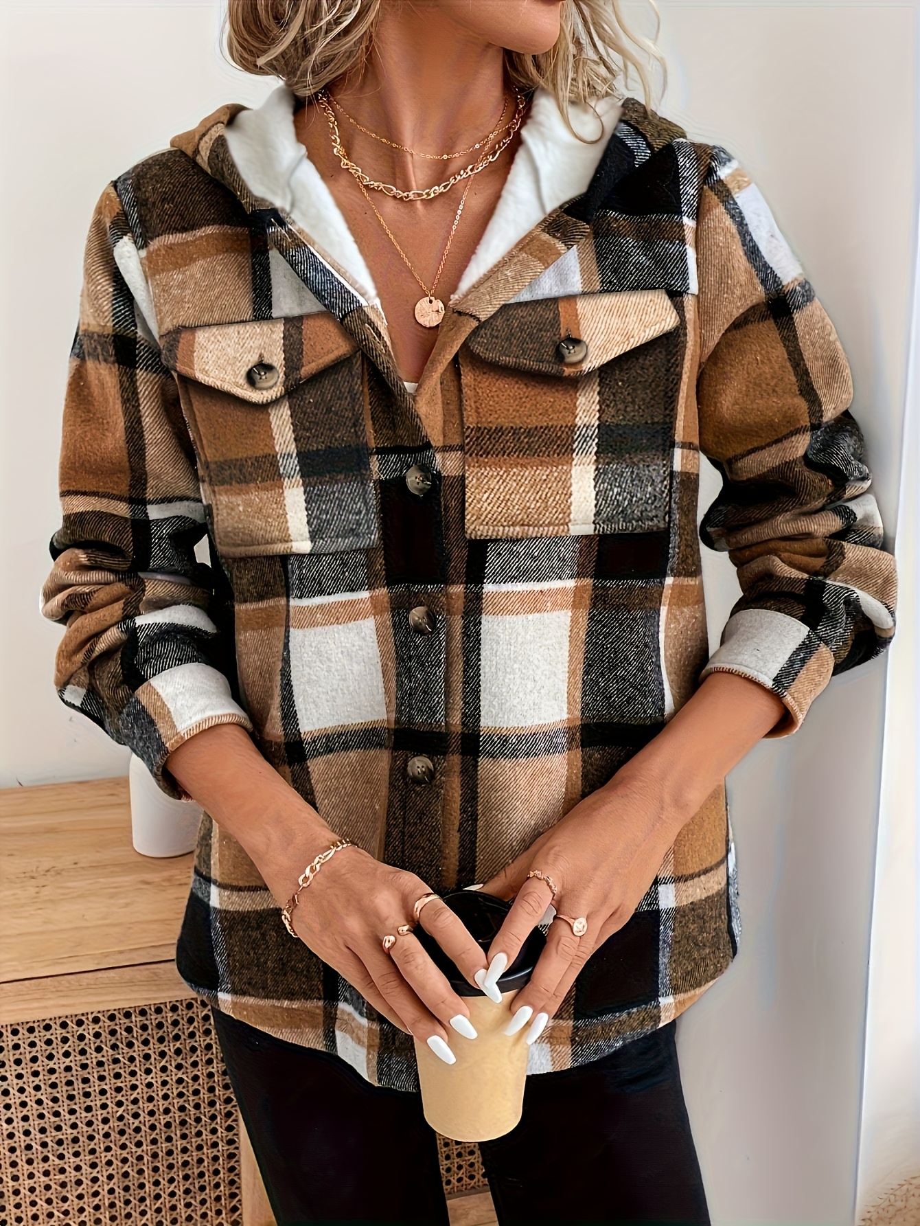 Women'S Casual Plaid Fleece-Lined Hooded Regular Jacket with Brushed Plaid and Hooded Shirt