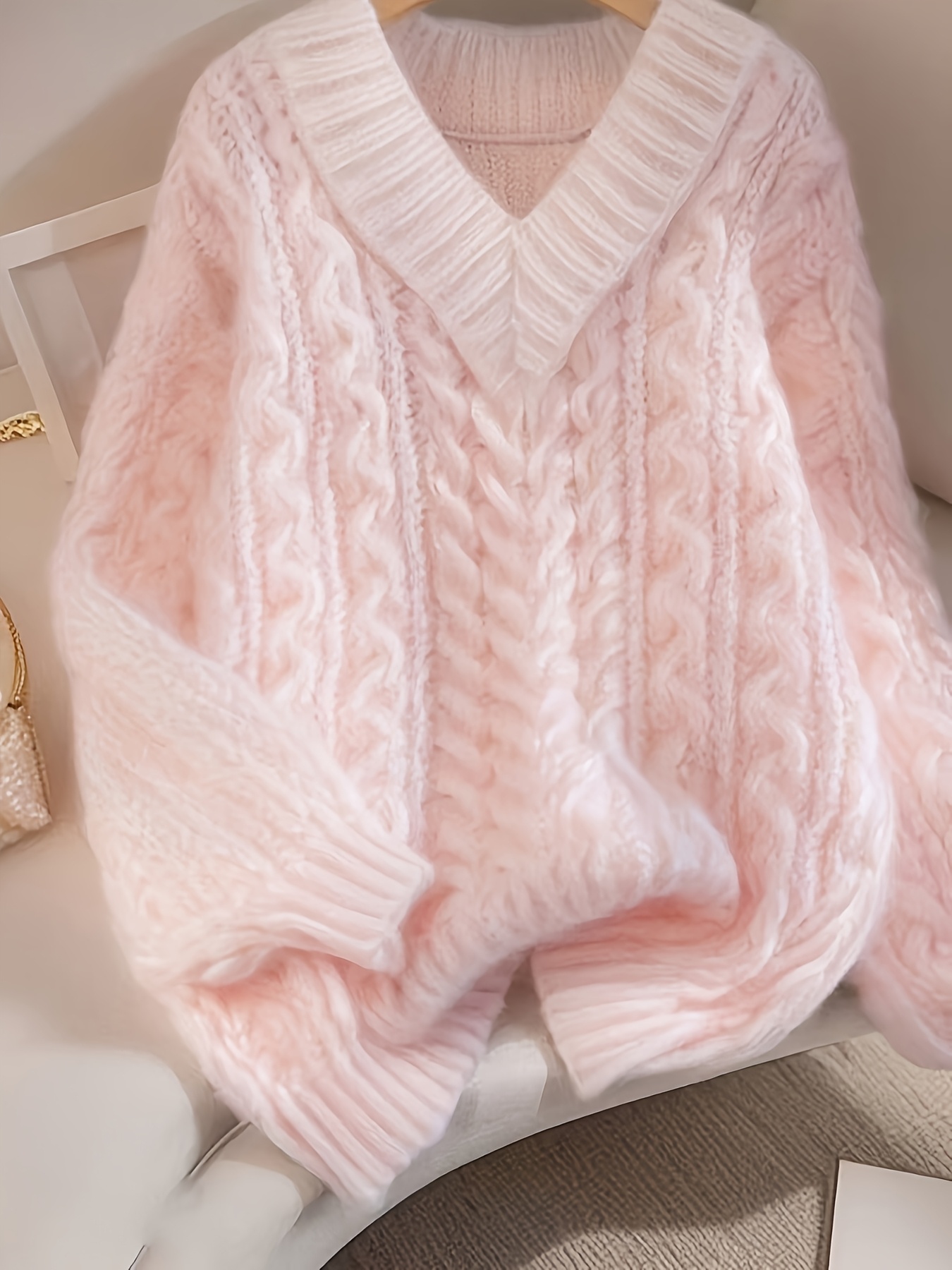 Gentle Pink Lazy Style Premium Loose V-Neck Twist Sweater for Women