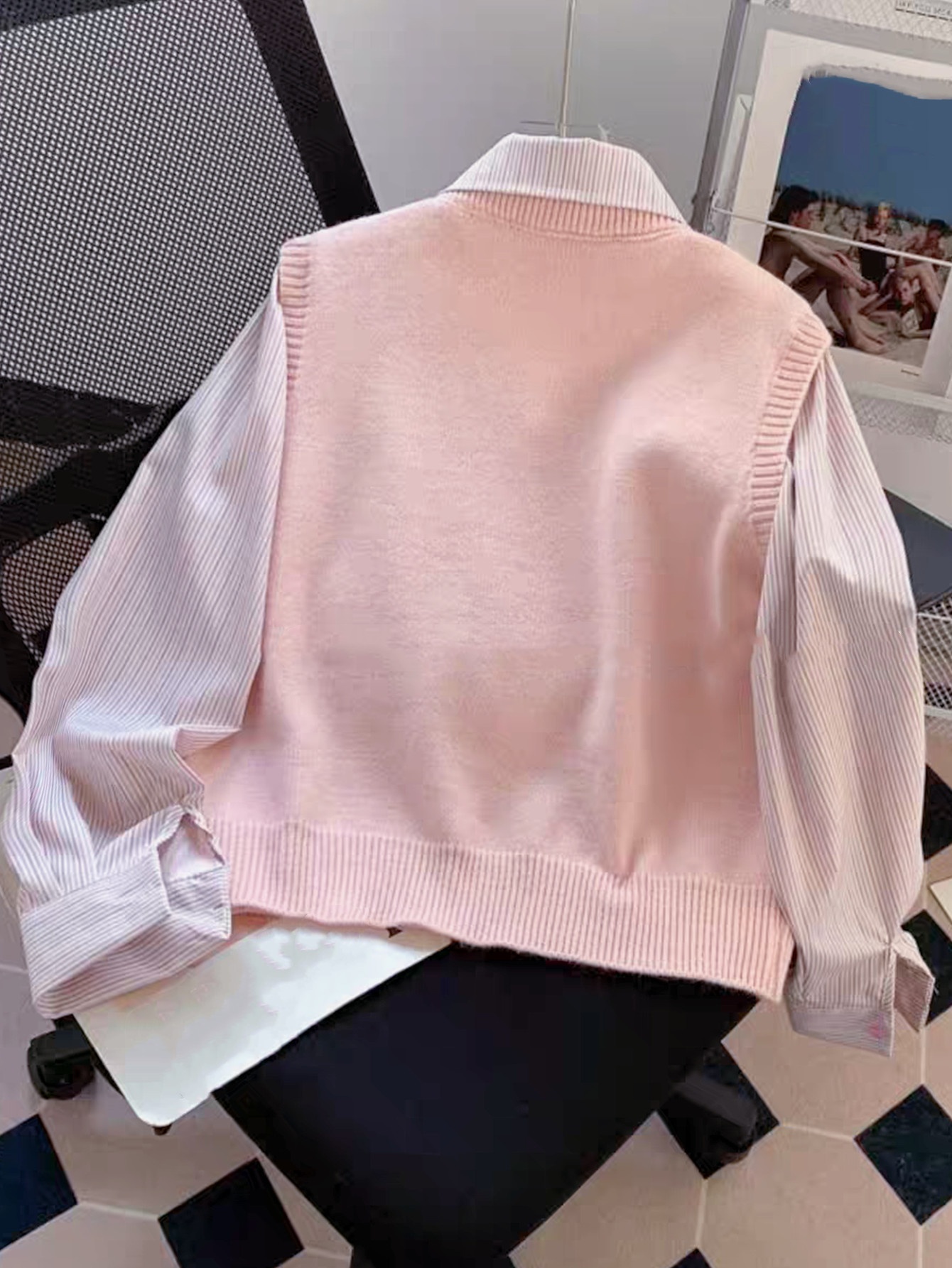 Women's Elegant Collar Sweater - Two-in-One Mock Layering Design, All-Season Office & Formal Events Sweater in Grey & Blue Horizontal Stripes, Non-Transparent Sweater for Women, Ladies Sweaters, Comfortable Fit