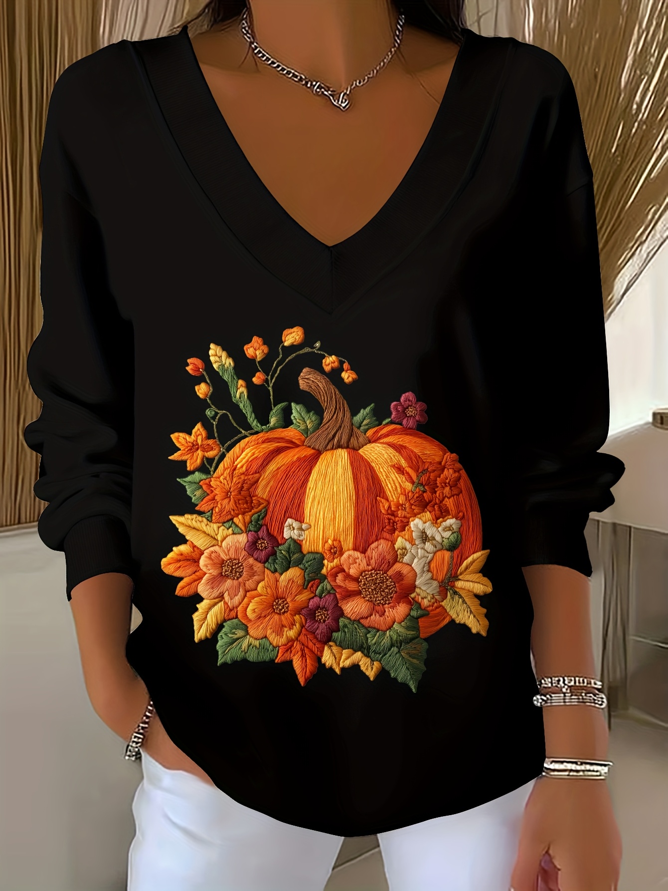 Women'S Halloween Witch Print Sweater - V-Neck Long Sleeve Pullover with Pumpkin & Floral Design, Loose Fit Casual Sweater for Fall/Winter, Halloween Clothes, Seasonal Fashion, Frenchinspired Style, Comfortable Wear, Fall Fashion, Frenchinspired Des