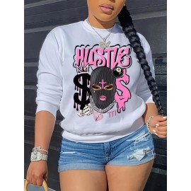 Women's HUSTLE Graphic Crew Neck Sweatshirt - Long Sleeve Casual Pullover with Print, Pink Dripping Letters & Money Motif, Cozy Fall Winter Streetwear, Machine Washable, Winter Apparel, Bold Design, Relaxed Fit