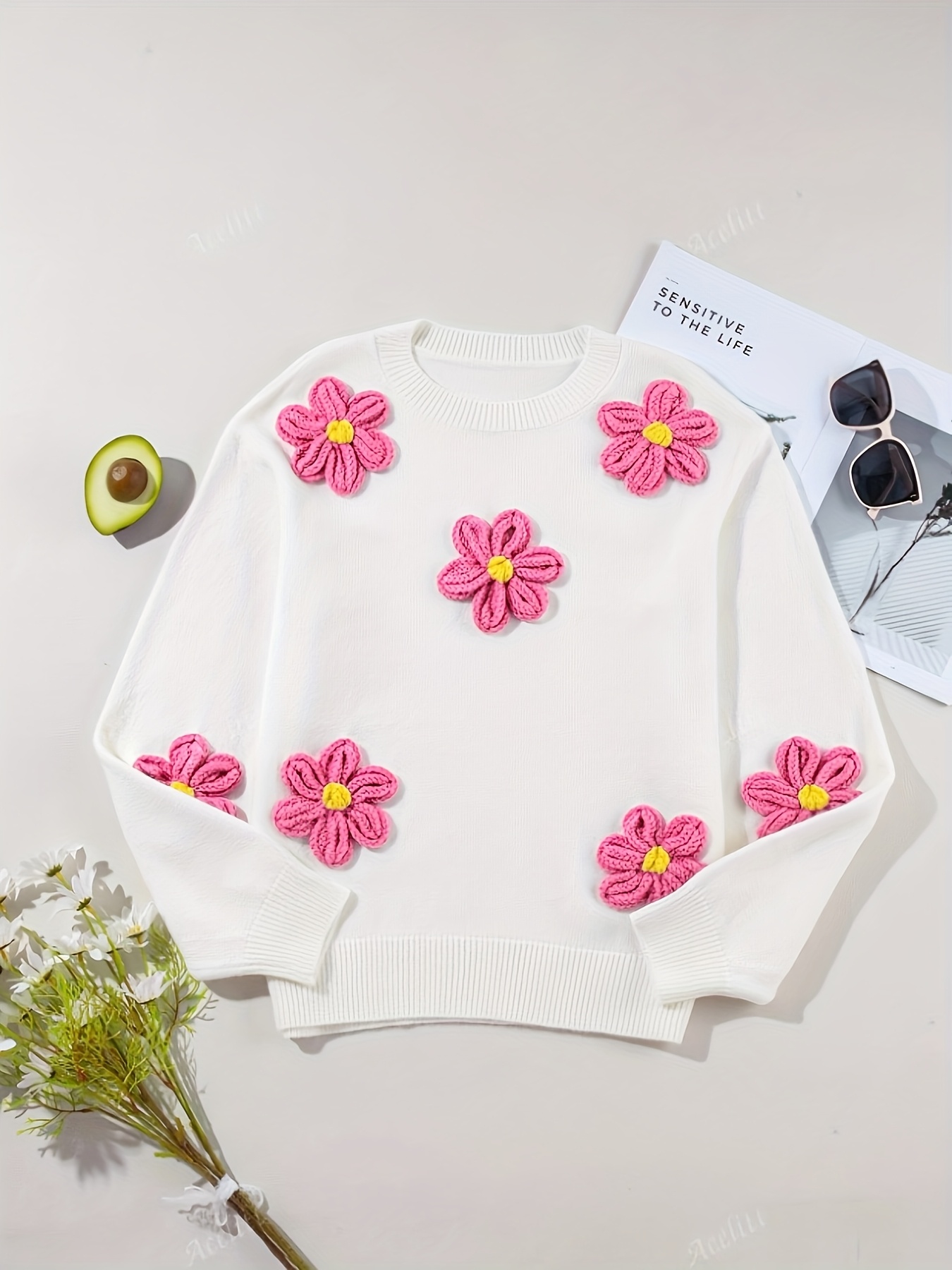 [Elegant Sweater] Valentine's Day Elegant Long Sleeve Crew Neck Sweater | Solid Color, Cute Flower Decorations, Women's Fashion - All Seasons