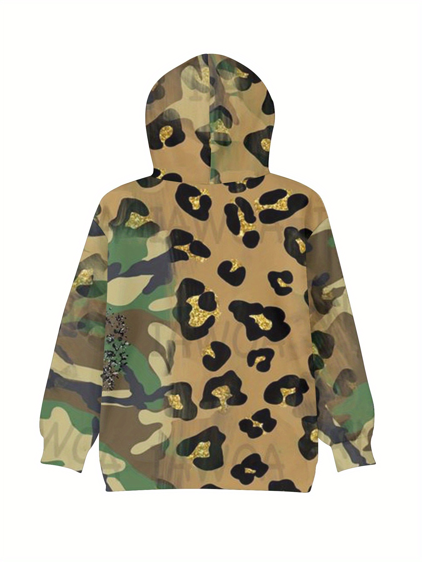 Women'S Camo Leopard Print Hoodie - Stylish Long Sleeve Pullover with Drawstring, 3D Digital Print, Stretchy Polyester, Casual Fit, Green & Black Design, Casual Wear Hoodie | Trendy Casual Style | Drawstring Hoodie