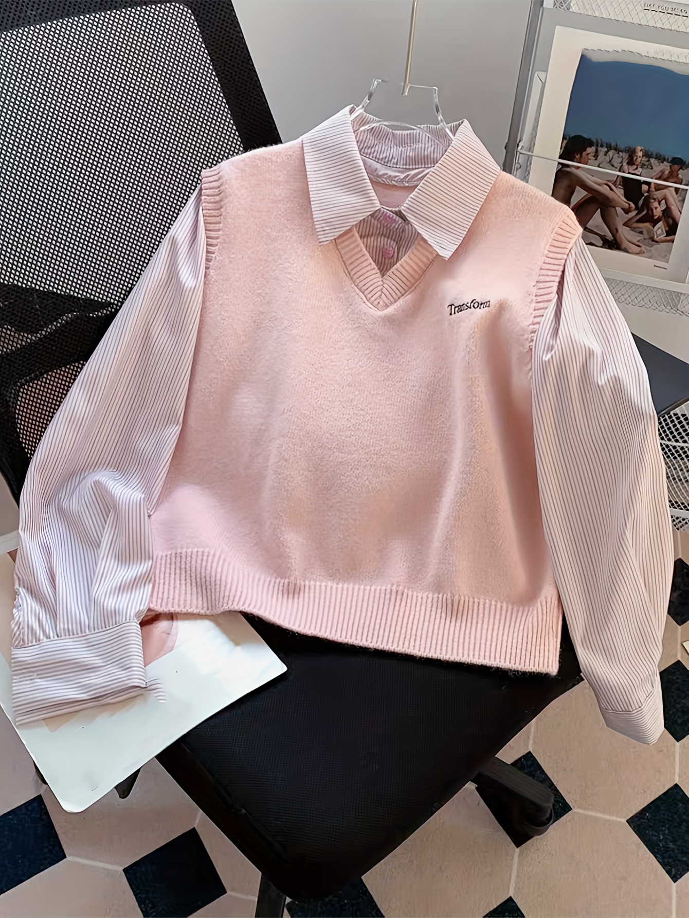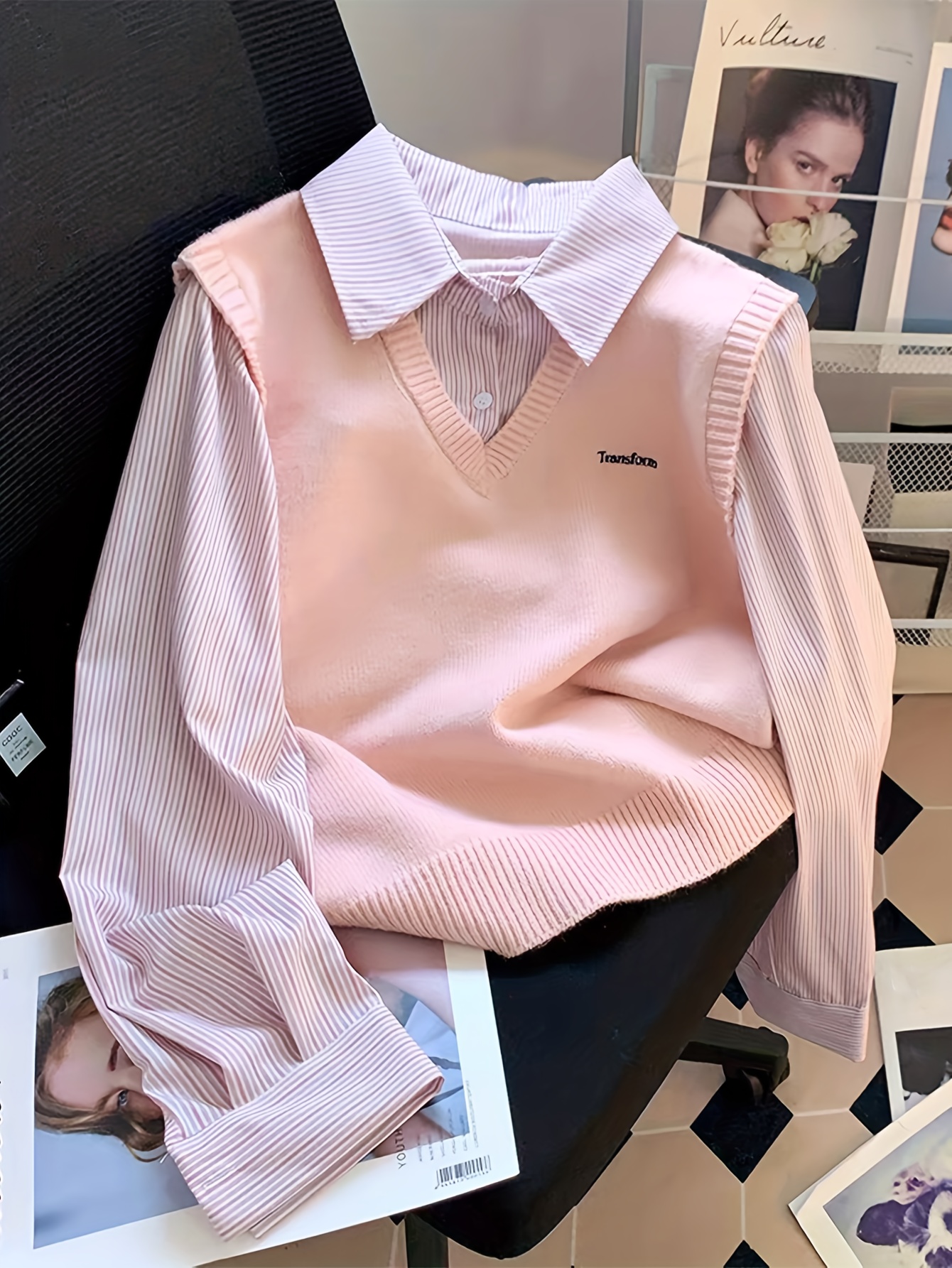 Women's Elegant Collar Sweater - Two-in-One Mock Layering Design, All-Season Office & Formal Events Sweater in Grey & Blue Horizontal Stripes, Non-Transparent Sweater for Women, Ladies Sweaters, Comfortable Fit